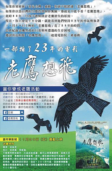 此外,當天也會舉辦兩場「老鷹想飛」電影特映座談會,林惠珊、農友林清源、老鷹想飛導演梁皆得等人都會出席,讓民眾認識老鷹生態,以及如何經由購買友善生態農產品保育猛禽與野生動物。
