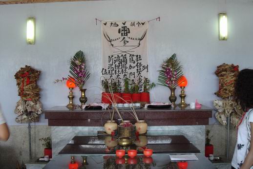 頭社公廨入口處的兵士座 平埔族以米酒和檳榔為祭祀供品,每一屏風前都有一兵士座和一個祀壺。