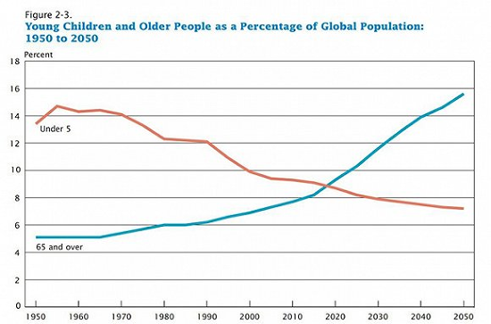 美國的一項最新報告指出,全球老年化的速度在加快。到2020年之前,5歲及以下兒童在全球人口中的佔比會少於65歲及以上的老年人,這種情況將是人類歷史上的首次。到2050年,老年人的比例會超過5歲以下兒童的兩倍多。