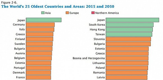 到2050年,預計會有9.75億老人生活在亞洲,佔全球老年人口的62.3%。按照報告的預測,日本、韩國、中國香港將會是2050年全球最老的國家和地區。