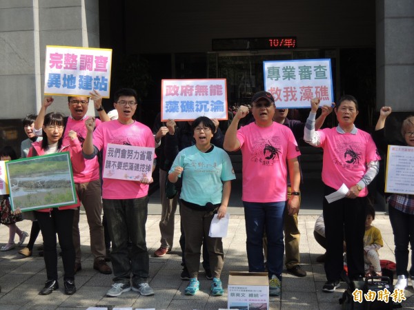 保育團體則在場外抗議,大喊「專業審查」、「異地建站」,不要破壞藻礁生態。(記者劉力仁攝)