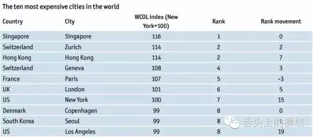 英國經濟學人智庫(EconomistIntelligence Unit)公布了"2016年全球生活成本報告"(Worldwide Cost of Living Report 2016),新加坡連續三年蟬聯全球最貴城市,中國香港躍居第二,與蘇黎世並列。進榜的第四至第七名城市分別為日內瓦、巴黎、倫敦、紐約,哥本哈根、首爾和洛杉磯並列第八。