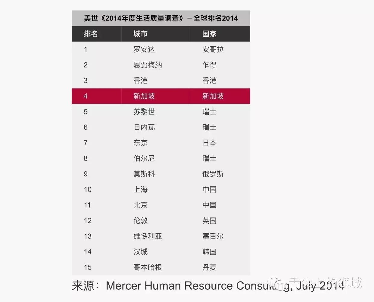 根據 2014 年美世生活質量調查全球城市排名,新加坡擁有最佳的環境、設備和基礎設施,使人民能夠享受高質量的生活。這是因為新加坡有穩定的政治形勢、世界級的交通和醫療保健系統以及多樣化的娛樂活動。