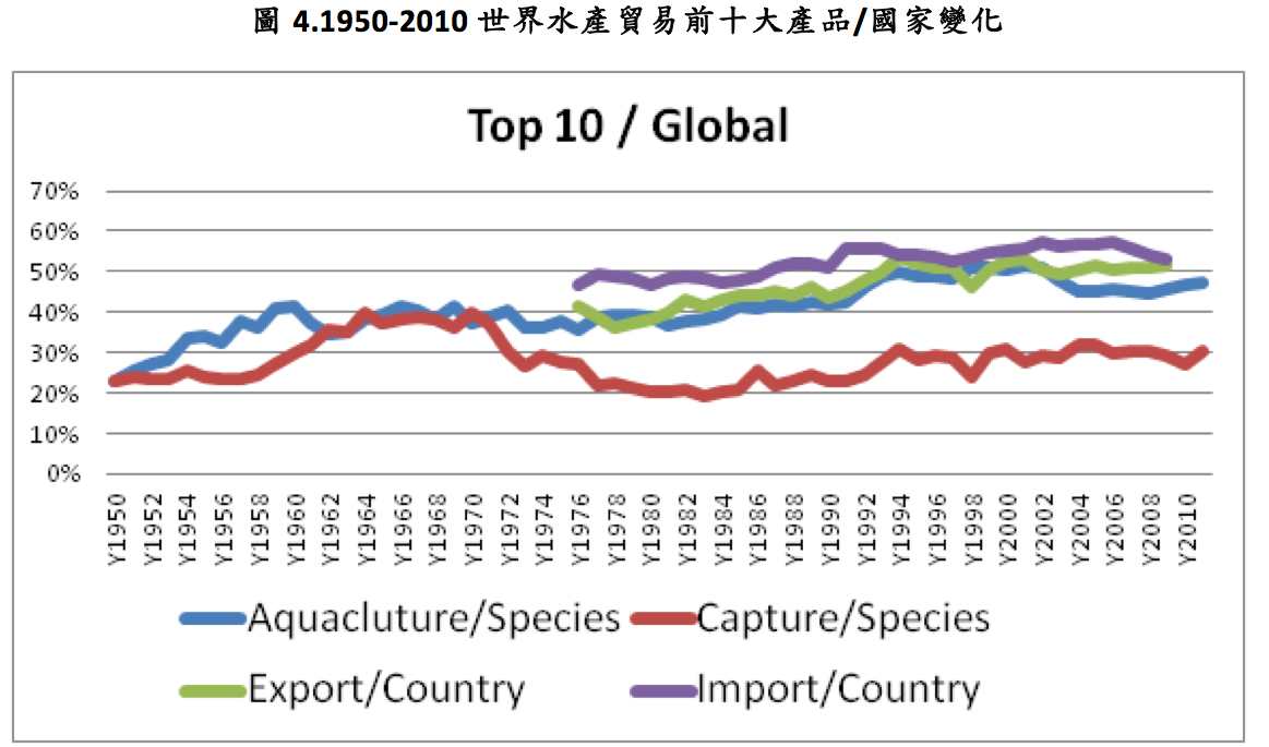 全球水產品的進出口集中在少數國家(日、美、中、西班牙、德、丹麥、泰國等),不論是進口還是出口,依據2010年的統計,前十大國家的總合都超過整體貿易量的50%。而養殖水產品前十大作物的貿易量總合,也佔世界水產品總貿易量近半。從這個世界的趨勢來看,台灣的水產品的需求與世界趨勢相符,除了遠洋捕撈之外,沿近海捕撈及養殖也是以供應國內市場的需求為主。