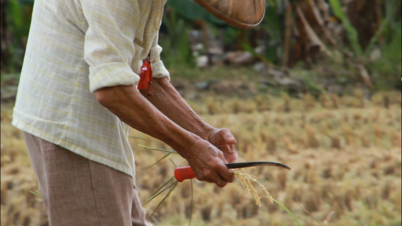 前年老阿嬤不幸跌倒,如今只能坐在輪椅上,不能再到田裡拾穗了,不過她的兒女繼承衣缽,每年收割後還是會到田裡拾穗,並且將撿回來的稻穗讓阿嬤挑選整理。雖然行動不能自在,但是她仍不願閒著過活。