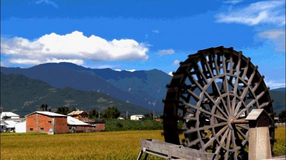 新興村的灌溉渠與自行車道旁的大水車已是著名拍照景點