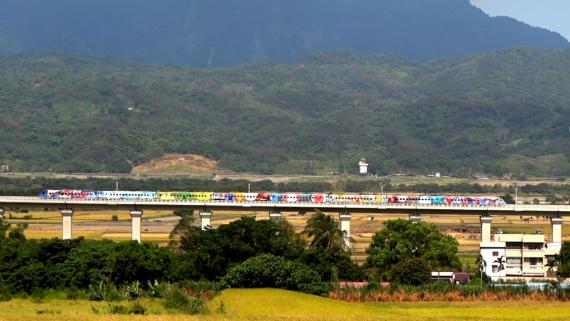 2014.11.15 台東縱谷位於台灣的東南一隅,許多人總以為遙不可及,過去從台北到台東,最快的自強號也要4.5小時,如果搭乘莒光號甚至要耗費7.5小時!自從普悠瑪自強號今年通車後,台北到台東只要3.5小時就可以到達, 北東一日生活圈儼然成形.旅客如果運氣好,還有機會搭乘由蕭青陽設計的彩繪普悠瑪號,奔馳在美麗的花東縱谷, 飽覽無可匹敵的田園美景。(蕭青陽設計的彩繪普悠瑪號首度台東出發)