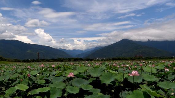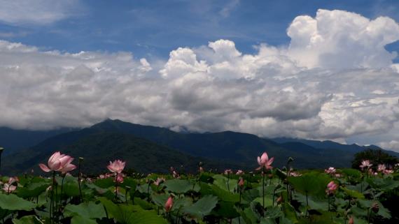 大坡池東岸的荷花與南橫群山相映成趣