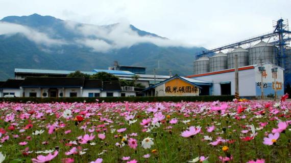 梓園米廠前的波斯菊正盛開