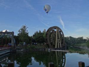 關山鎮親水公園熱氣球起飛於水車之上的美景