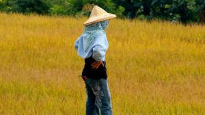 豐碩的金黃稻田與體態健美全身包裹得密不通風的農家少婦
