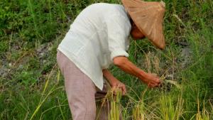 在稻田裡拾穗的近百歲的老阿嬤