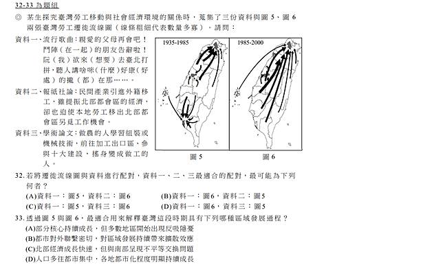 麗山高中教師廖偉國分析,第32至33題,林強的〈向前走〉並未特別強調大量人口移往台北市的年代,要以歌詞去判斷屬於圖五或圖六的年代是有難度的,且33題不論是圖或題幹都沒有資料說明是反吸或擴散,學生不容易以此做判斷。