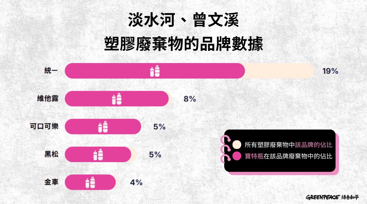 綠色和平東亞分部在 11 月 7 日於臺北辦公室公布「東亞河川塑膠垃圾品牌檢視」調查,臺灣、韓國、香港三地的河川廢棄物中,塑膠垃圾占比高達 91.1%。其中,統一企業、LOTTE樂天和維他奶,分別是臺、韓、港河川塑膠垃圾最多的品牌,而國際品牌(太古)可口可樂則在三地均名列前三。(延伸閱讀:綠色和平首次河川廢棄物品牌檢視 統一、樂天、維他奶、可口可樂塑膠垃圾最多)