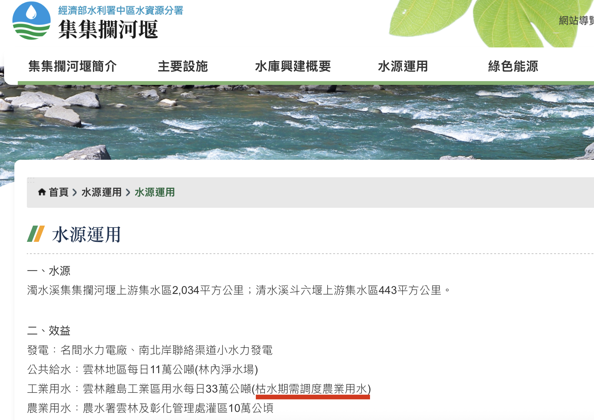農水署副署長陳衍源回覆,濁水溪水的調度與分配全由水利署主理,「集集攔河堰分配多少農水,我們就拿多少水來用」,不過他也強調,「農業用水都有拿到該用的量」。